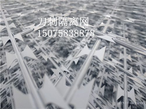 1、 采用v網架設,用鐵絲網打造成v型通長架設在隔離網上部,然后將蛇腹形刀刺網架設上。這個方法的好處是非常牢固,造型大氣。但是成本較高。