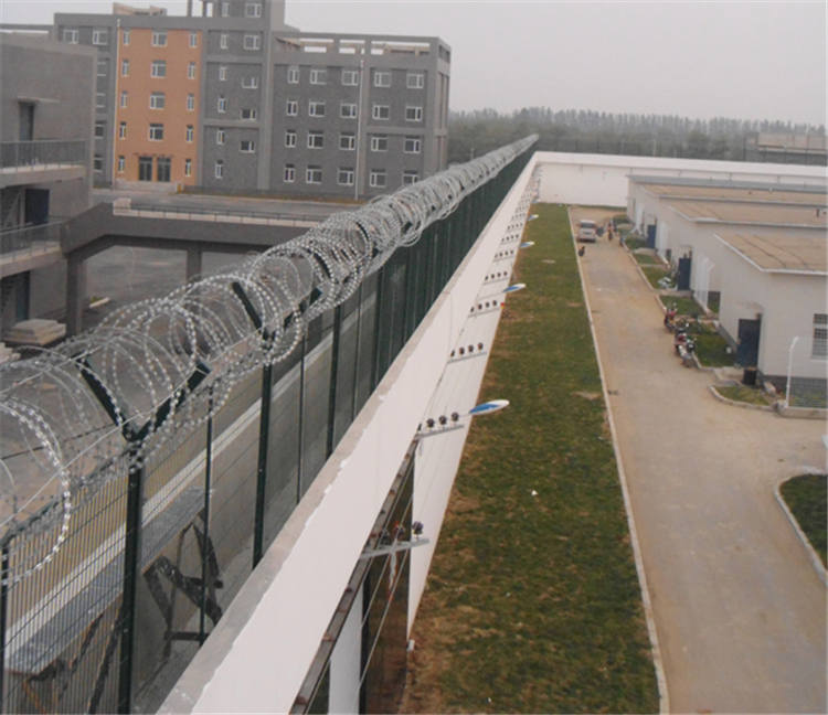 監獄墻隔離網一般是由Y型立柱和加強型網片而組成,上面安裝50、60或者80公分的刀刺滾籠,安全防御級別很高,被廣泛應用于戒毒所、看守所、監獄、軍事基地等高安全場所。